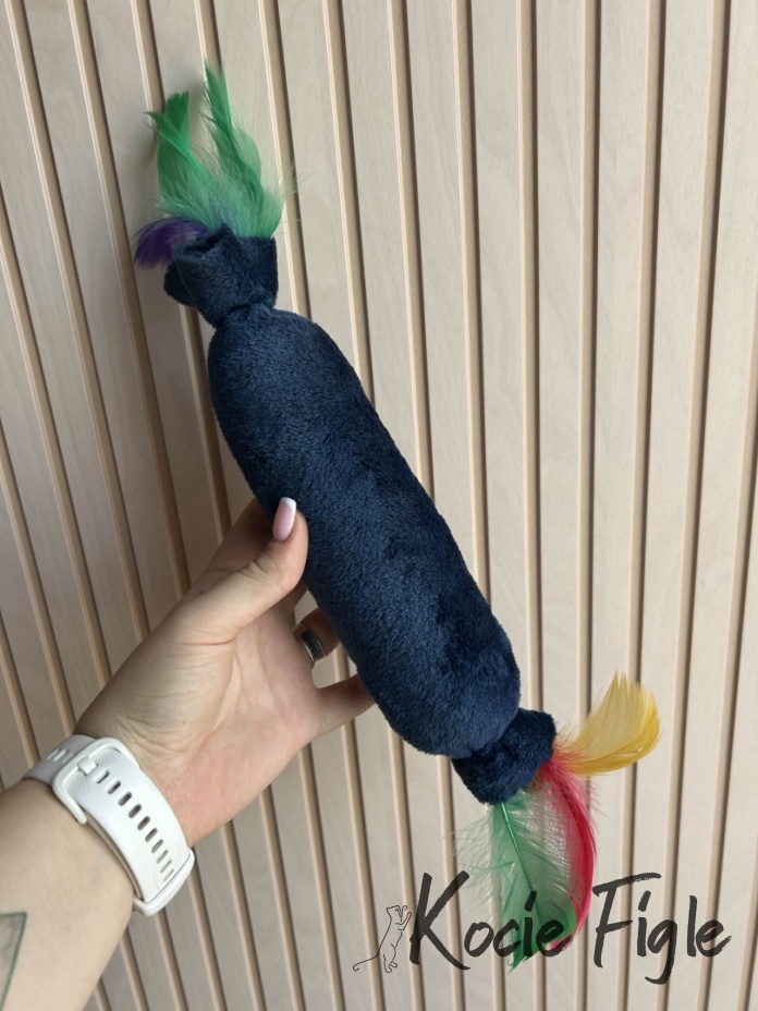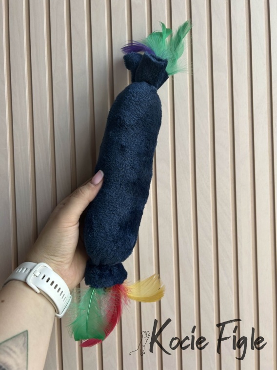 Granatowy kopacz „Cukierek” to połączenie atrakcyjnego kształtu, pobudzającej kocimiętki i kolorowych piórek, które rozbudzą instynkt łowcy u każdego mruczka.