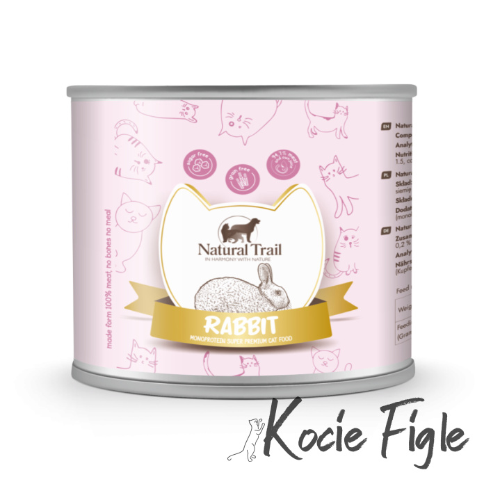 - Bez Dodatku Kości: Natural Trail Monoprotein eliminuje dodatek kości, co sprawia, że podajesz kotu jedynie delikatne kawałki mięsa królika. Idealne rozwiązanie dla tych, którzy chcą kontrolować konsystencję diety swojego pupila.