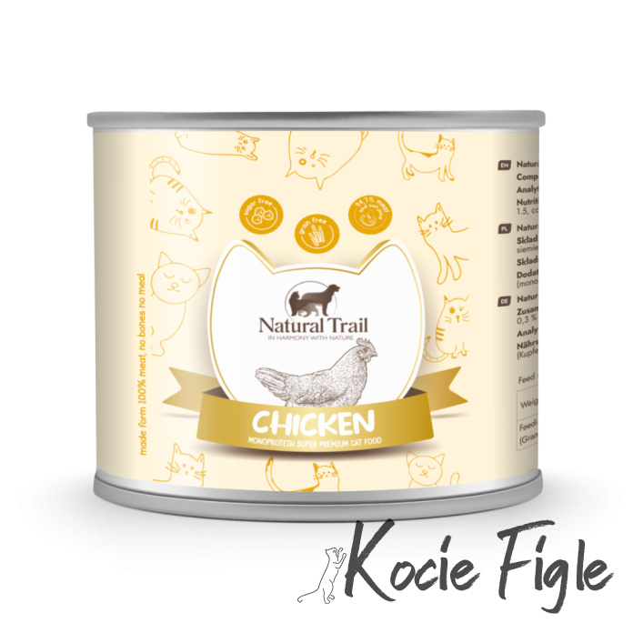 • Bez Dodatku Kości: Natural Trail Monoprotein eliminuje dodatek kości, co sprawia, że podajesz kotu jedynie delikatne kawałki mięsa kurczaka. Idealne rozwiązanie dla tych, którzy chcą kontrolować konsystencję diety swojego pupila.