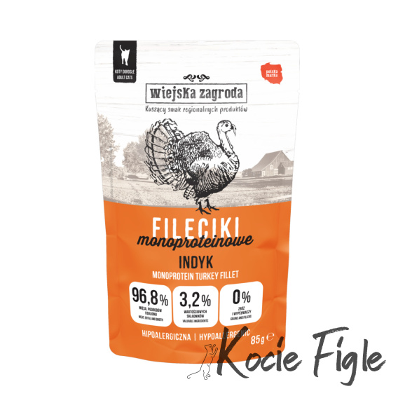 Monoproteinowe fileciki Wiejska Zagroda to idealny wybór! Każda saszetka zawiera starannie wyselekcjonowane kawałeczki mięsa indyka o doskonałej konsystencji, które są wyjątkowo apetyczne dla każdego kota. Dzięki aż 96,8% zawartości mięsa, podrobów oraz bulionu, bezzbożowej recepturze oraz hipoalergicznemu składowi, fileciki sprawdzą się nawet u kotów z delikatnym układem pokarmowym.
