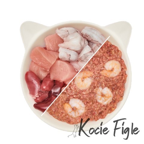 Zawiera 99% kurczaka i krewetek - mięsa, podrobów i bulionu.