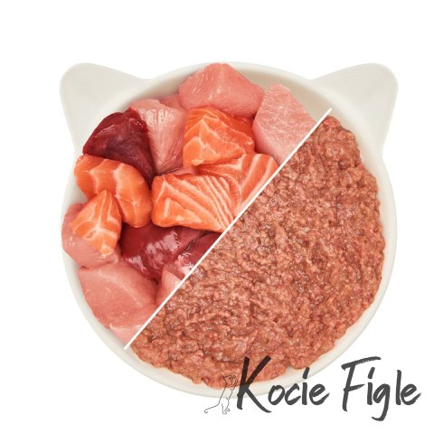 Zawiera 99% kurczaka i łososia - mięsa, podrobów i bulionu.